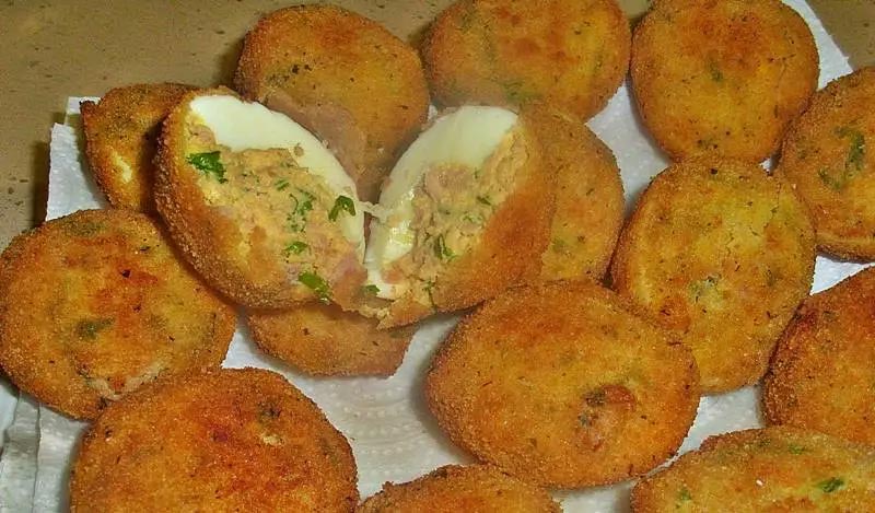 - Passa as metades de ovo, já recheadas, por farinha depois por ovo batido (para esta quantidade é suficiente 1 ovo) e de seguida por pão ralado.