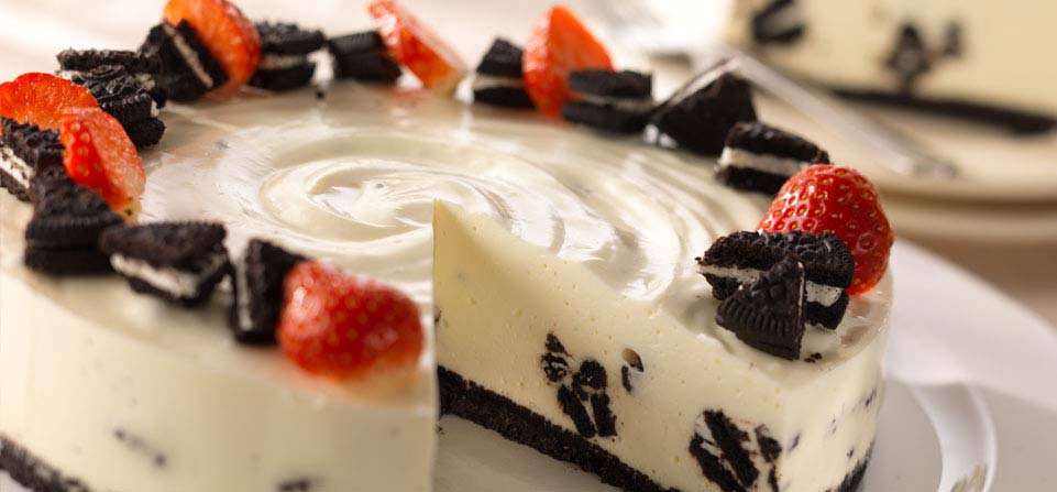- Decorar com morangos cortados e pedaços de bolacha Oreo, antes de servir.