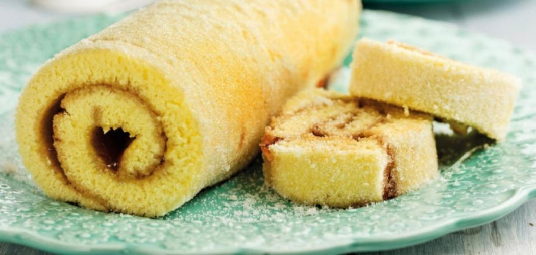 - Leve ao forno durante cerca de 10–15 minutos. Desenforme, ainda quente, sobre papel vegetal polvilhado com açúcar, barre com a geleia ou compota da sua preferência e enrole cuidadosamente.